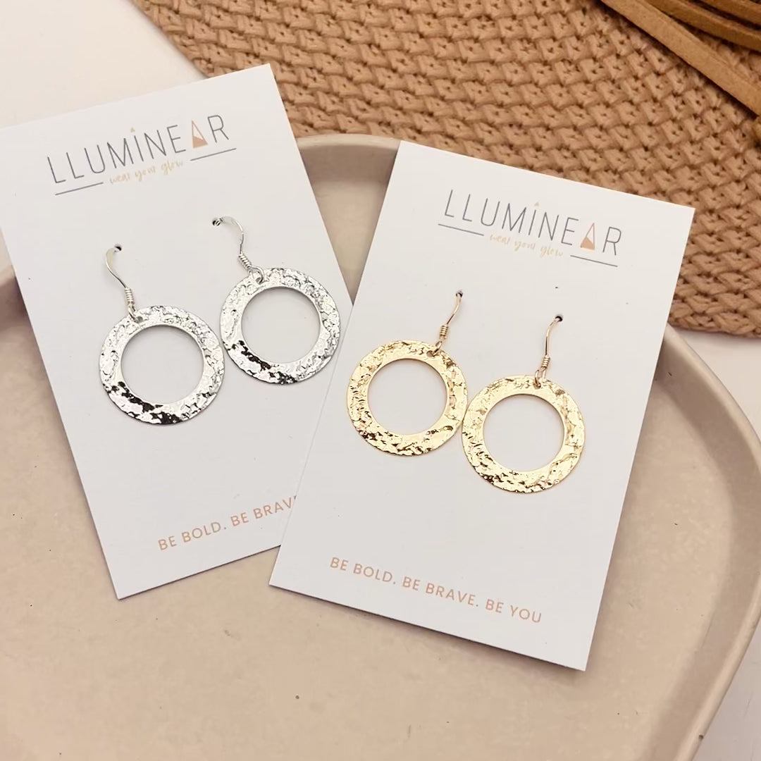 Add some glow to your day with these stylish hook earrings featuring textured circles with an eye catching crinkle finish. Available with silver or gold hooks, these shine and catch the light beautifully. A pair you will wear all year round.
